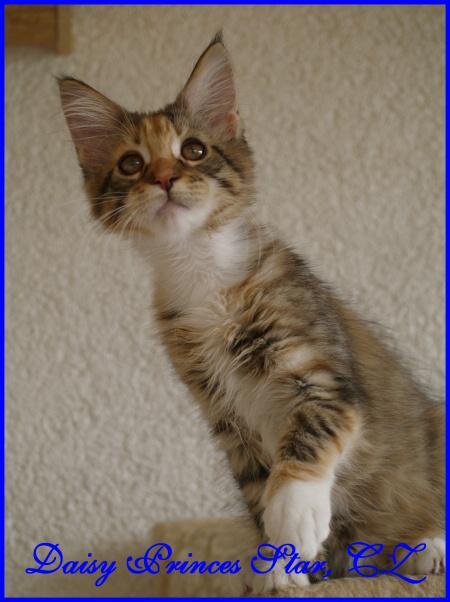 Její název PRINCES STAR, CZ byl vybrán po našem prvním mainském mývalím kocourkovi, který nás bohužel předčasně opustil. Jmenoval se IVANHOE OF GENTLE LIONS, CZ - domácky Princ, Princátko.