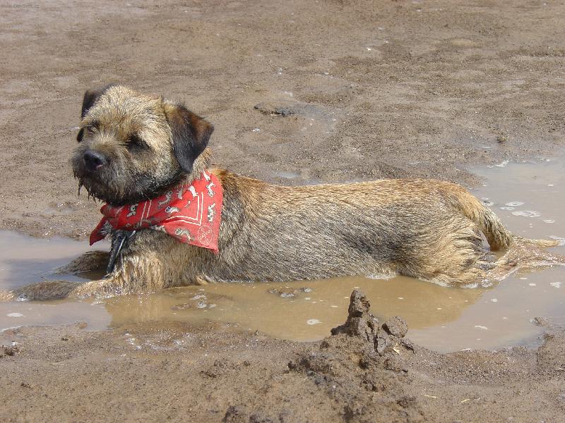 Borderteriér s červeným šátečkem ležící v bahnité kaluži